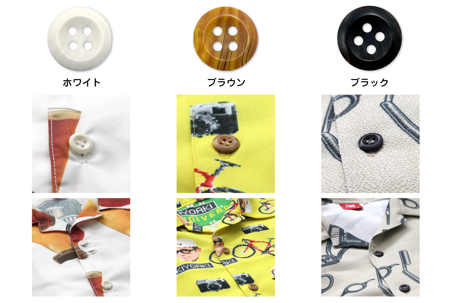 ボタン色が選べる 小さなボタンひとつで、アロハの印象は大きく変わります。ボタンカラーはホワイト・ブラウン・ブラックの3色をご用意。お気に入りを選んであなただけの1枚を完成させましょう。