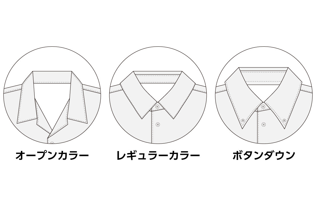 衿が選べる 定番の「オープンカラー」以外に「レギュラーカラー」「ボタンダウン」もご用意いたしました。ご利用シーンに合わせた衿のタイプを選ぶことができます。